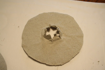 Take the circle you just made and cut out batting and material just slightly larger. Glue all edges onto back side of circle. Don't attach to top of shade yet. We will do that later.